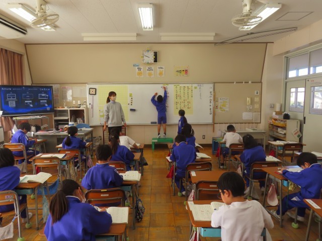 1年生は、国語で「日づけとよう日」の学習をしていました。この学習では、「月」を「つき」や「げつ」と読むなど、同じ漢字でも読み方が変わることについて学びました。子どもたちは、声に出して確かめながら、楽しそうに漢字の読み方を覚えていました。