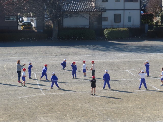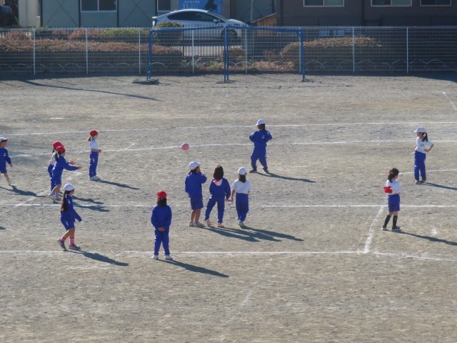 1年生は、体育でボールを使った運動に取り組んでいました。今日は校庭で、ドッジボールを中心に活動しました。少し寒い一日でしたが、子どもたちは元気いっぱいに体を動かし、楽しみながら運動に取り組んでいました。
