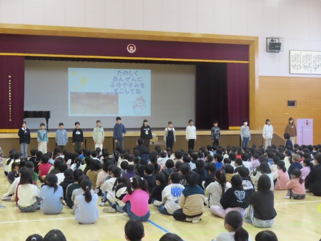 長かった二学期も本日で無事に終わりました。本日は体育館にて終業式を行い、校長先生からのお話や児童会からの発表があり、二学期を振り返る大切な時間となりました。この二学期は、さまざまな行事や日々の学習活動を通して、子どもたちは一人一人着実に成長する姿を見せてくれました。明日から始まる冬休みも、健康と安全に十分留意しながら、家庭や地域の中で充実した生活を送り、希望をもって三学期を迎えてほしいと願っています。二学期を無事に終えることができましたのも、日頃より本校の教育活動にご理解とご協力をいただいている保護者の皆様、地域の皆様、そして関係する多くの方々の温かい支えのおかげです。心より感謝申し上げます。今後とも本校教育への変わらぬご支援を賜りますよう、よろしくお願いいたします。