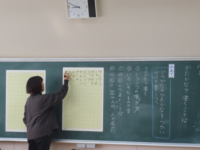 2年生は国語の授業で「かたかなで書くことば」の学習をしていました。今日は、みんなでかたかなで書けることばを探し、それをノートにたくさん書き記していました。どの子も熱心に取り組み、普段使う言葉を思い付いては次々に書いていく姿がとても楽しそうでした。