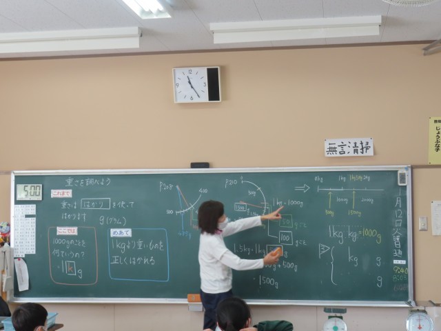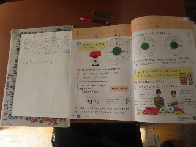 3年生の算数では、「重さを調べよう」の学習をしています。この単元では、新しく「kg(キログラム)」という単位が出てきます。今日は、はかりを使って、目盛りをどのように読めばよいかについて学習を進めました。実際に確かめながら、重さへの理解を深めることができました。