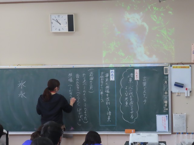 5年生は、国語科で「言葉でスケッチ」の学習に取り組みました。一枚の写真をさまざまな観点から観察してメモをとり、その内容を文章で表現する活動です。子どもたちは熱心に考えをまとめながら、自分の感じたことや気づきを文章に表していました。