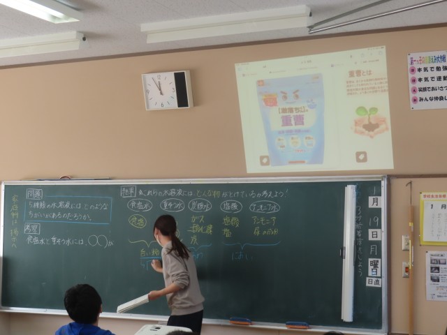 6年生が理科の授業で水溶液の学習に取り組んでいました。今日は、実験の結果をもとに、5種類の水溶液がどのように異なるのかを考察する活動を行いました。子どもたちは、実験で得られた観察結果をもとに、仲間と意見を出し合いながら熱心に考えていました。