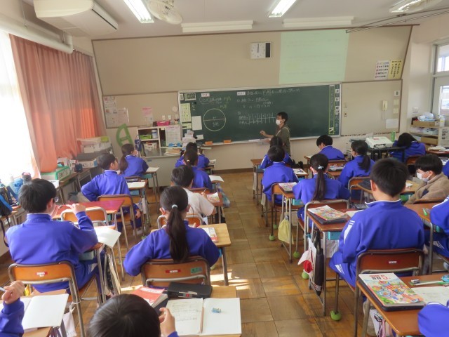 5年生の算数では「正多角形と円」の学習に取り組んでいます。今日は「直径の長さと円周の長さの関係を調べる」をめあてに学習しました。最終的には円周の長さが直径の長さに比例することを理解していました。
