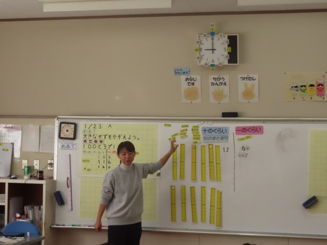 1年生は算数で「大きな数」について学習しています。今日は「100より大きい数」の表し方について、みんなで考えながら学びました。さまざまな方法で数を表現し、理解を深めています。