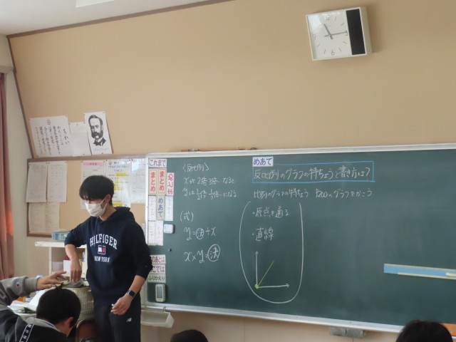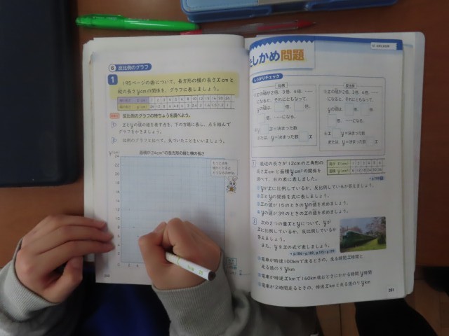 6年生は、算数で「比例と反比例」の学習をしています。今日は、反比例のグラフの特徴について考えました。面積が同じ長方形の縦と横の長さの関係を、教科書にある方眼を使って視覚的に表現し、そのグラフの形状から反比例の特性を学びました。児童たちは、グラフの形を確認しながら、比例と反比例の違いをより深く理解しようと積極的に取り組んでいました。