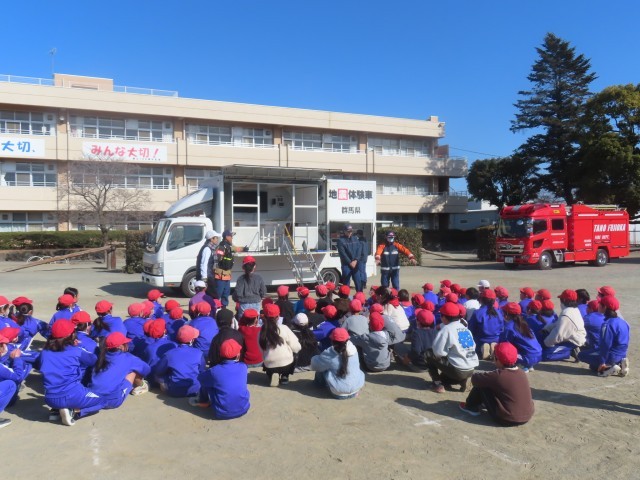 本日、藤岡消防署の方にお世話になり、3年生が起震車体験を行いました。震度5の揺れを体験し、地震発生時の状況を具体的に想像することができたようでした。また、教員を対象に関東大震災を再現した揺れも体験させていただき、震度5を大きく上回る揺れに驚かされました。今回の体験は、防災について改めて考えるよい機会となりました。