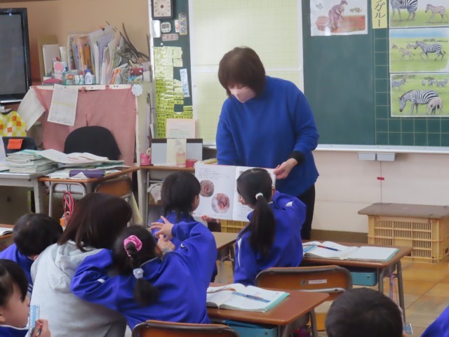 1年生の国語では、説明文「どうぶつの赤ちゃん」の学習をしています。学習内容もほぼ終わり、本日はカンガルーの赤ちゃんの様子について読み取りました。実際のカンガルーの赤ちゃんの写真を見て、その小ささに驚く様子が見られました。