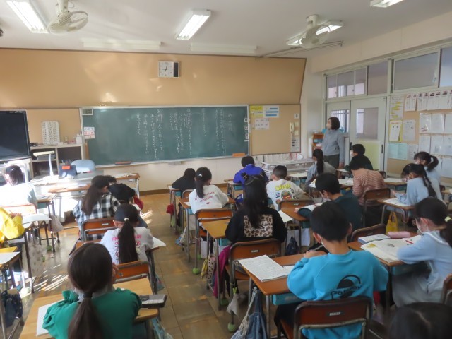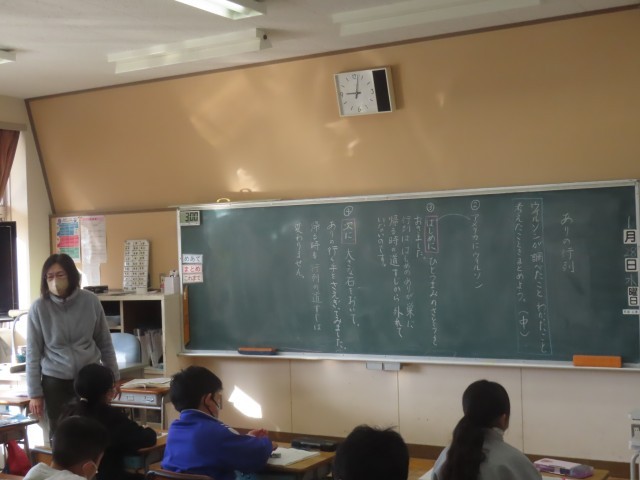 3年生は国語で説明文「ありの行列」の学習をしていました。今日は中の場面で主人公がどのようなことを調べ、どのようなことがわかり、どんな考えをもったのかについて、本文を丁寧に読み取っていました。つなぎの言葉を意識しながら、文章の内容を理解しようと意欲的に読み取っていました。