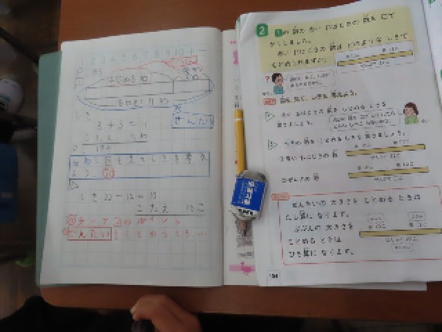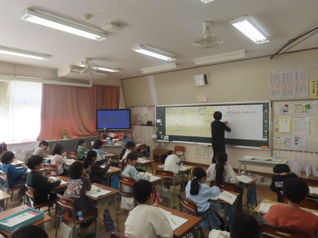今日は2年生の算数の学習があり、「たし算とひき算の関係」を学びました。「図を見て式を考えよう」をめあてに、子どもたちは図をじっくり見ながらどの式を使うか考えていました。最後には、全体を求めるときはたし算、部分を求めるときはひき算を使うことをまとめ、理解を深めていました。