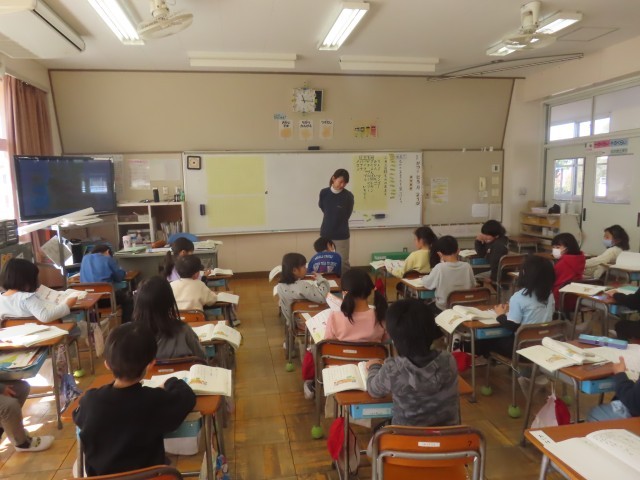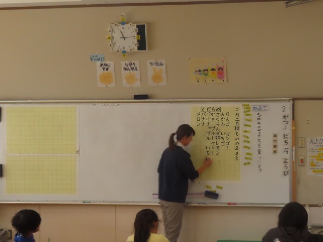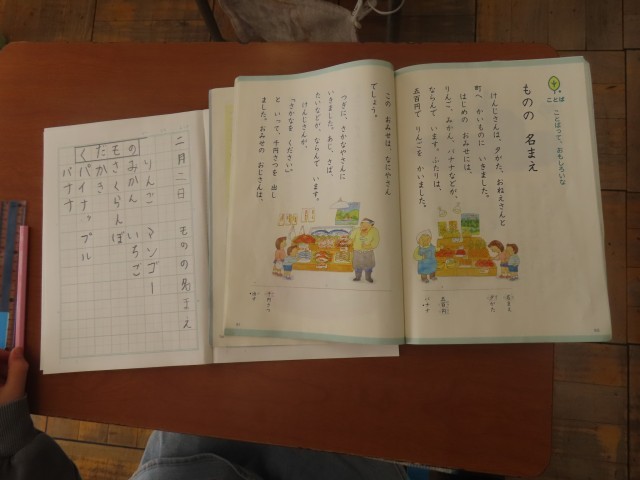 今日は1年生が国語で「ものの 名まえ」の学習をしていました。今日はくだものの名前をみんなで見つけて、ノートに書きためていました。たくさんの名前が見つかり、子どもたちは楽しそうに取り組んでいました。
