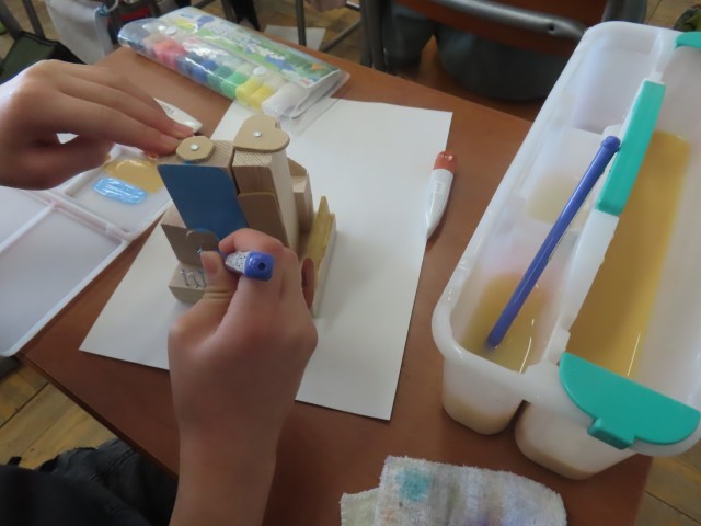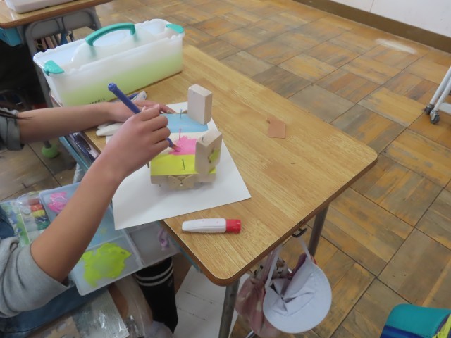 3年生は、図工の学習で木材を釘で打ち付けて作品を作っています。今日は、できあがった作品にそれぞれ思い思いの色をつけ、絵の具で仕上げをしていました。子どもたちは、作品に個性を表現する楽しさを味わっていました。