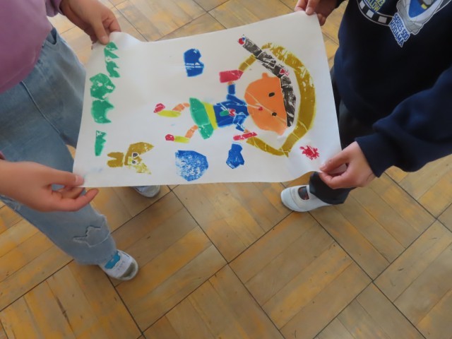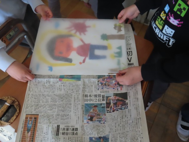 1年生は図工で紙版画に取り組んでいました。1年生が取り組んだ版画は、色の付いた紙を台紙に貼り、その上に水でぬらした印刷用の紙をのせることで、貼り付けた色紙の形や色が写し取られる仕組みになっています。作業を楽しみながら取り組み、どの子も上手な作品を仕上げていました。