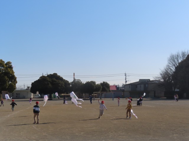 1年生が生活科の学習で凧揚げをしました。子どもたちは自分で描いたオリジナルの絵が入った凧を手に、校庭で楽しく飛ばしていました。今日はあまり風がなく、上手に飛ばすのが難しい様子も見られましたが、何度も挑戦するうちに、上手な子は凧を高く上まで飛ばすことができました。空に凧が舞い上がると、子どもたちからうれしそうな声が上がり、笑顔あふれる学習の時間となりました。