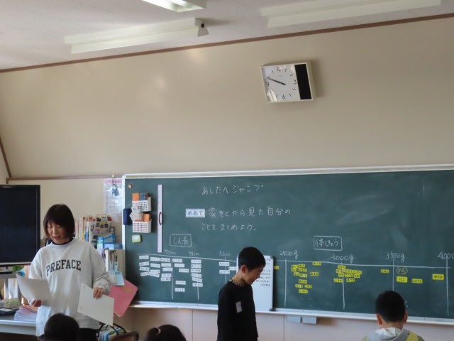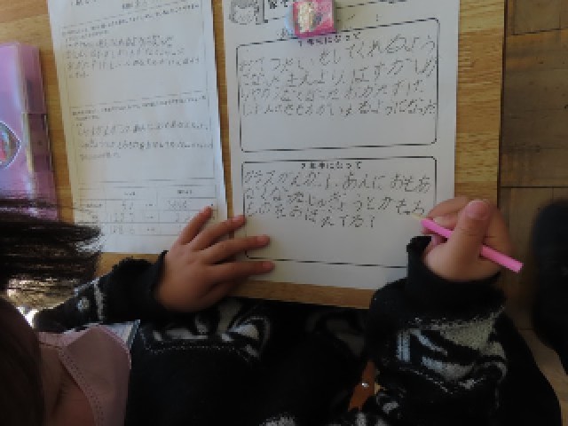 2年生が生活科で「あしたへつなぐ」の学習をしていました。今日は、家族にインタビューした内容をもとに、家族から見た自分の様子やよさについて、一人一人がワークシートにまとめていました。家族の言葉を思い出しながら、うれしそうに書き進める姿が見られました。