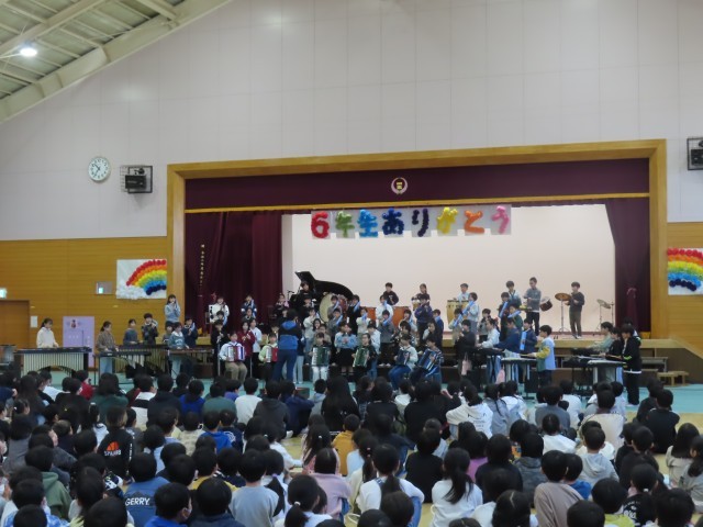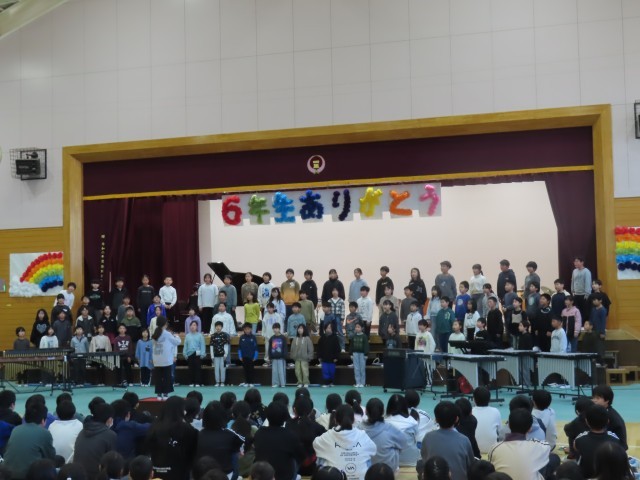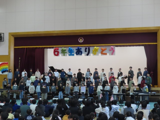 送る会の後半は4年生と5年生の発表でした。さすが高学年らしく、息の合った迫力ある演奏と力強く美しい歌声が体育館いっぱいに響き渡り、堂々とした立派な発表となりました。これまで学校を支えてきた6年生も、その頼もしい姿に安心した表情を見せながら発表を見守っていました。4年生、5年生の真剣なまなざしや一体感のある姿からは、これから学校を引き継いでいこうとする意気込みが感じられ、6年生も安心してバトンを託す気持ちをもつことができたのではないかと思います。