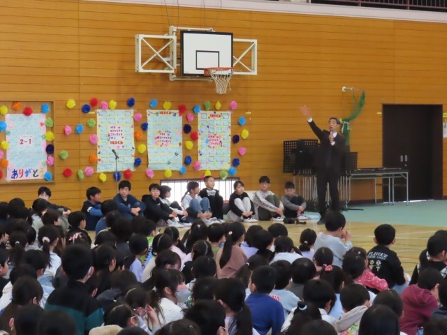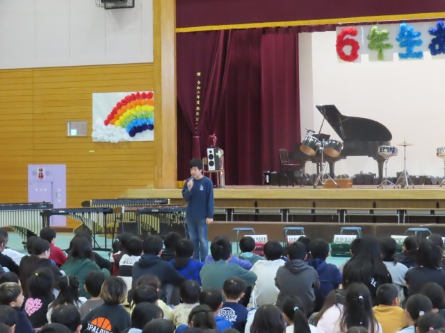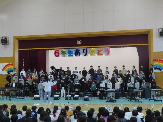 送る会の最後は、6年生からのお礼の発表でした。さすが最高学年と思わせる堂々とした演奏と心のこもった合唱は、会場全体を引き込み、下級生の心をしっかりとつかみました。その姿からは、これまで学校をリードしてきた自信と誇りが感じられ、下級生にとっても「あのような6年生になりたい」という憧れの気持ちが一層高まったことと思います。最後は再び花のアーチで6年生を見送り、温かな拍手に包まれながら会は幕を閉じました。6年生のみなさん、中学校でもこれまでの経験を生かしてがんばってください。そして、今回の会をしっかりと運営した5年生の姿も大変立派でした。最高学年へと向かう自覚が感じられ、頼もしい引き継ぎの一日となりました。