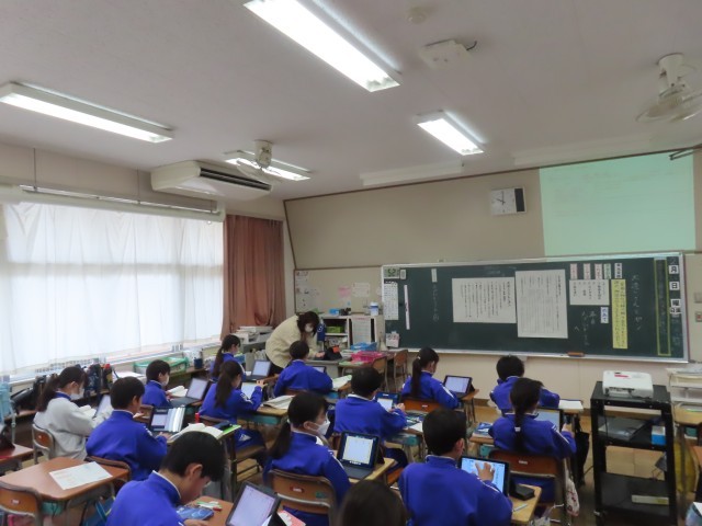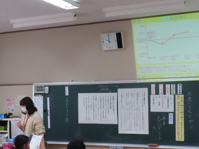 5年生は国語で物語文「大造じいさんとガン」の学習をしています。とても有名な作品です。この単元では、「登場人物の心情の移り変わりをとらえて読み、物語の魅力をまとめて伝え合おう」という目標のもと学習に取り組んでいます。今回は、提示された複数の課題を自分で順序や取組方を決めながら読み進めるなど、一人一人が自分のペースで考えを深めています。自ら課題に向き合い、主体的に学ぶことを大切にしながら、物語の魅力を味わっていってほしいと思います。