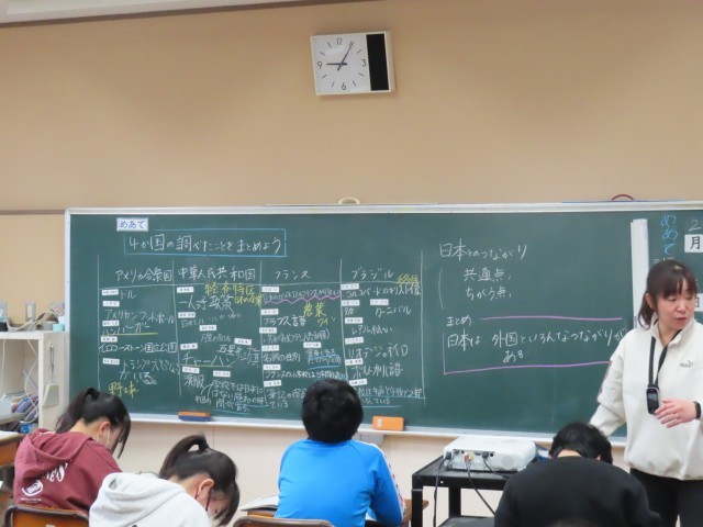 6年生は社会科で「日本とつながりの深い国々」の学習をしています。今日はこれまで調べてきた4つの国について、みんなでまとめを行いました。それぞれの国と日本との関わりを整理しながら学習内容を振り返り、理解を深めることができました。
