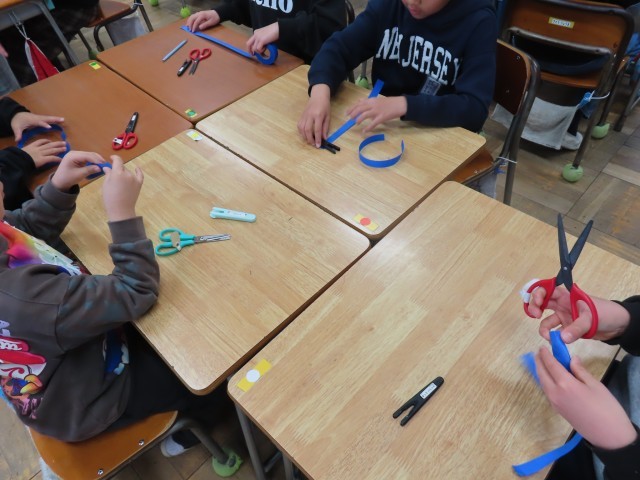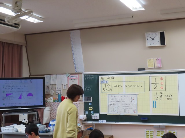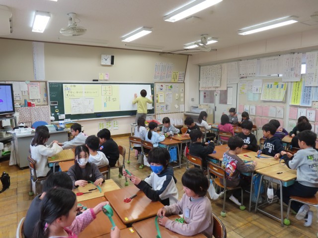 2年生の算数では、「分数」の学習が始まりました。分数という考え方に触れるのは今回が初めてです。今日は、同じ大きさのものを2つに分けたうちの1つが「2分の1」になることを学習しました。紙テープを実際に半分に切るなどの活動を通して、2分の1の大きさを体感しながら理解を深めていました。
