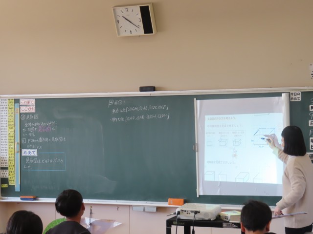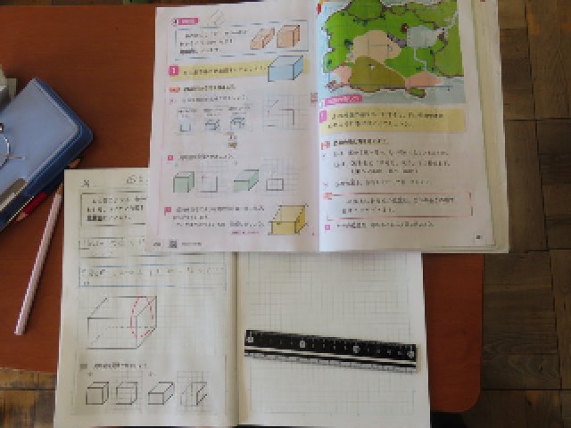 4年生の算数では、「直方体と立方体」について学習しています。今日は、立体の見取図のかき方について学習しました。見取図では、見えない辺をどのように表すかがポイントになります。子どもたちの中には表し方に迷っている様子も見られましたが、友達と意見を交流したり、先生の説明を聞いたりしながら理解を深めていました