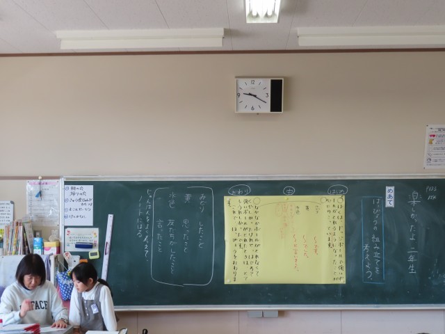 2年生は国語で「楽しかったよ、二年生」の学習をしていました。2年生での思い出を組み立てを考えながら文章にまとめ、発表する学習です。今日は、2年生の間にどのような思い出があったかを振り返りながら、友達と話し合ったりしながら一人一人が楽しそうに考えていました。