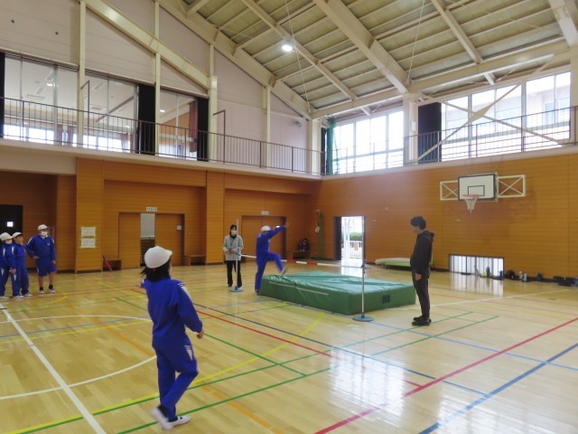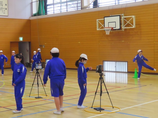 4年生が体育の授業で高跳びに取り組んでいました。今日もタブレットを活用し、自分のフォームを確認しながら練習を行っていました。映像を見ながら、よりよい跳び方について考える姿も見られました。また、本物のバーも使用し、これまでの練習の成果を発揮しながら、意欲的に挑戦していました。