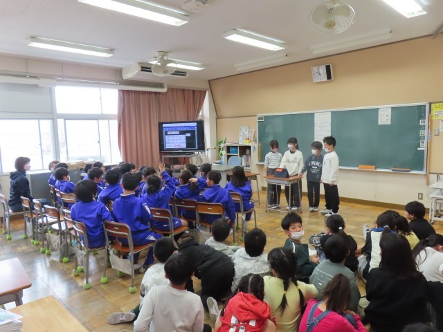 3年生は、総合的な学習の時間に福祉について学んできました。今日は、これまでの学習のまとめとして、班ごとに内容を整理し、2年生に向けて発表を行いました。2年生にも分かりやすく伝わるように、言葉や説明の仕方を工夫しながら、一生懸命発表する姿が見られました。