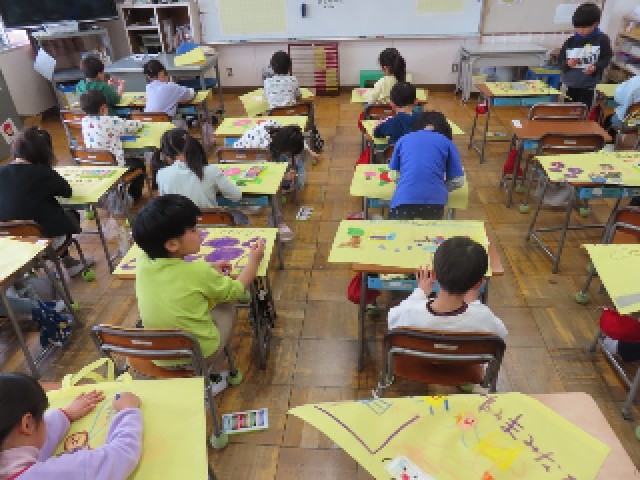 1年生が図工の授業で、作品バッグに絵を描く活動に取り組んでいました。思い思いに好きな絵や模様を描き、それぞれに個性あふれる作品に仕上がっていました。どの子も楽しそうに活動に取り組んでいる様子が見られました。