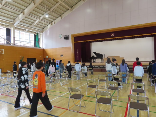 本日、卒業式の予行練習を行いました。当日と同じ流れで全体を通して練習し、式の進行や動きの一つ一つを丁寧に確認しました。当日参加する5年生も6年生と一緒に取り組み、会場の雰囲気づくりにも力を発揮していました。5年生、6年生ともに真剣な表情で練習に臨み、とても立派な態度が見られました。来週火曜日の本番では、これまでの練習の成果を発揮し、6年生が晴れやかな気持ちで卒業の日を迎えられることを願っています。