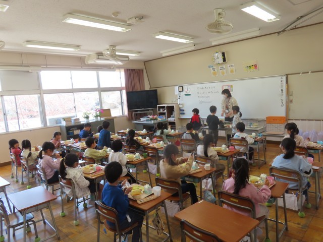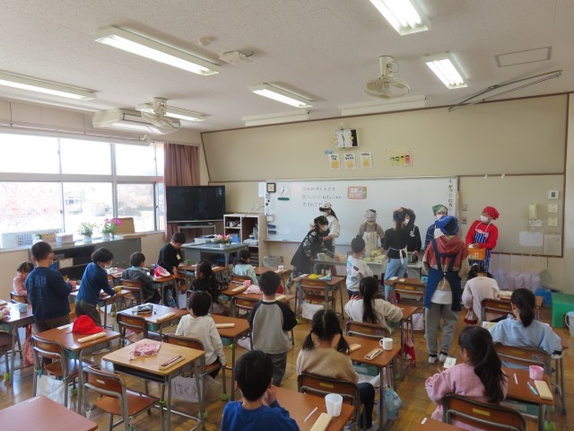 今日から給食が始まりました。1年生にとっては楽しみにしていた初めての給食で、配膳や準備は6年生が行い、1年生は席について待ちながら、わくわくした様子で給食の時間を迎えていました。しばらくは6年生が準備や片付けを手伝ってくれる予定で、上級生の姿から多くのことを学んでいくことと思います。どの子もおいしそうに給食を食べる姿が見られ、笑顔あふれる時間となりました。これからも給食の時間を楽しみにしながら、しっかりと食べて元気に過ごし、健やかに成長していってほしいと思います。