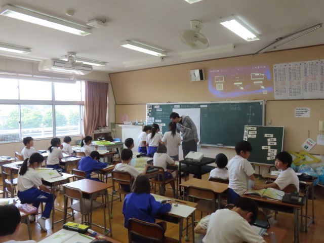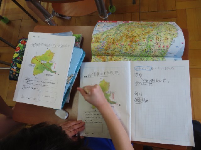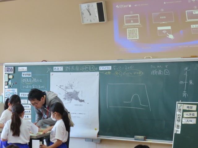 4年生が社会の学習に取り組んでいました。4年生の社会では、3年生よりも学習の範囲が広がり、県についての学習へと進んでいきます。今日は群馬県の地形にはどのような特徴があるのかについて、地図帳を活用しながら、みんなでその特徴を探していました。山地や平野の様子に着目し、気付いたことを伝え合う姿が見られ、意欲的に学習に取り組んでいました。