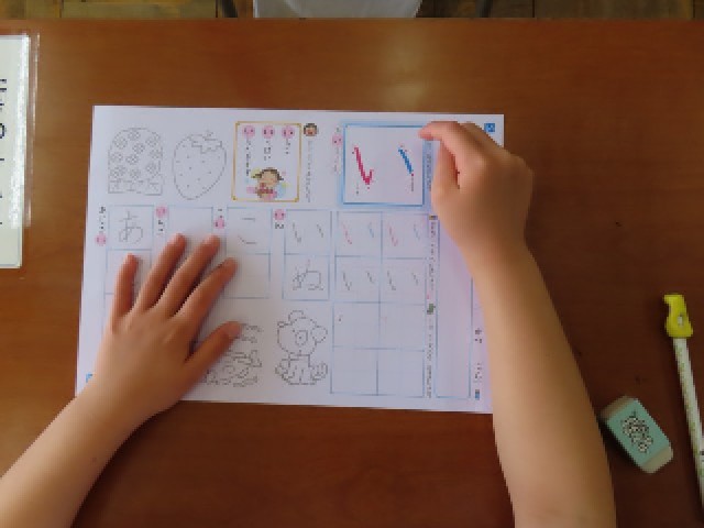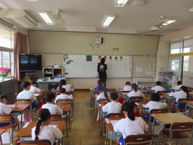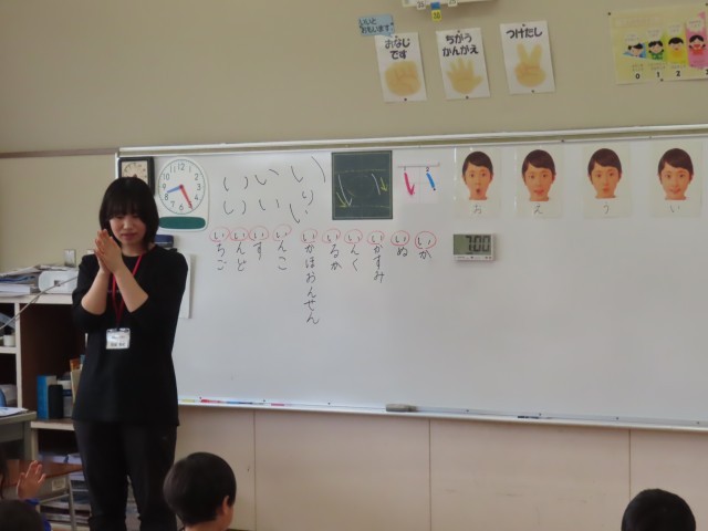 1年生が国語でひらがなの学習に取り組んでいました。今日は「い」の学習を行いました。手拍子に合わせて「い」のつく言葉をみんなで声に出したり、楽しみながら言葉集めをしたりする姿が見られました。その後は、字の形や書き順に気を付けながら、「い」を一文字一文字丁寧に書く練習にも取り組んでいました。子どもたちは集中して、きれいな字を書こうとがんばっていました。