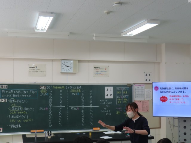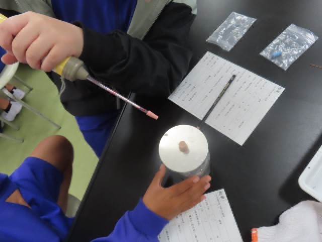 6年生が理科の学習で実験に取り組んでいました。今日は「物が燃える前と後で、空気はどのように変化するのか」という課題を解決するため、気体検知管を使って酸素や二酸化炭素の濃度を測定しました。子どもたちは、実験の手順を確かめながら慎重に操作し、数値の変化を確かめていました。新しい実験器具を使うことに興味をもち、意欲的に観察や記録に取り組む姿が見られました。
