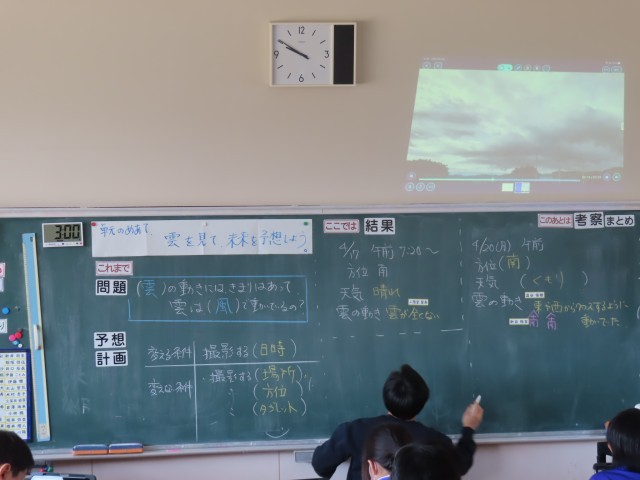 5年生は、理科で「天気の変化」の学習をしています。今日は、学校から撮影した雲の様子を早送りの映像で観察し、天気の変化との関係について考えました。子どもたちは、雲の動きや広がり方に注目しながら、時間の経過による変化を捉えていました。映像で見ることで、変化の様子が分かりやすく、理解を深めることができました。