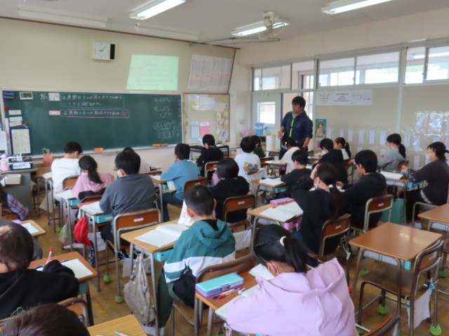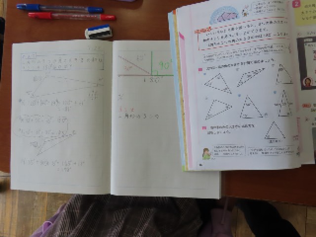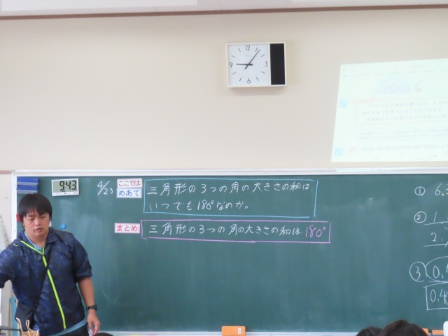 5年生の算数では「図形の角の大きさ」の学習をしています。この単元では三角形や四角形の角の大きさについて理解を深めていきます。本日は三角形の3つの角の大きさの和が180°になることを学習しました。子どもたちは実際に角度を測ったり、図を使って確かめたりしながら、そのきまりに気付き、意欲的に学習に取り組んでいました。