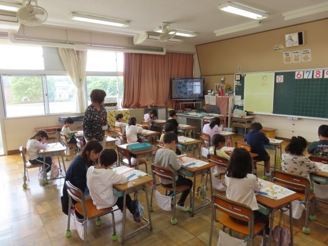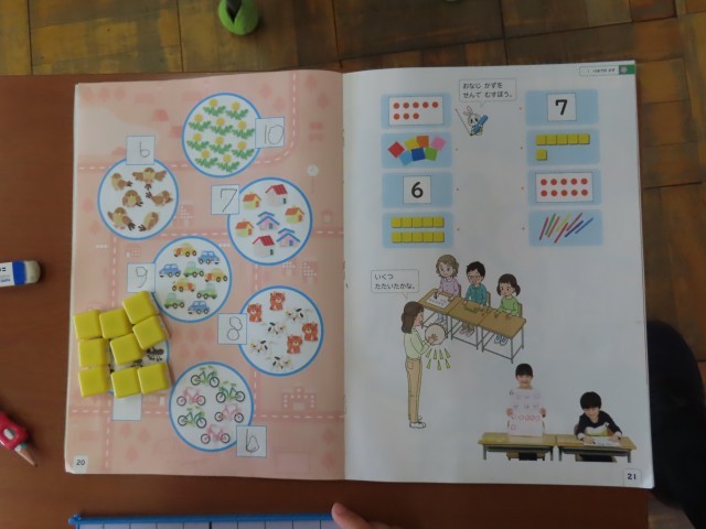 1年生の算数では、数の学習に取り組んでいます。今日は教科書の絵と同じ数のブロックを準備し、絵と具体物、数字を結び付けて一体的に捉えられるように学習を進めていました。子どもたちは実際にブロックを操作しながら、数の意味や数え方への理解を深めていました。