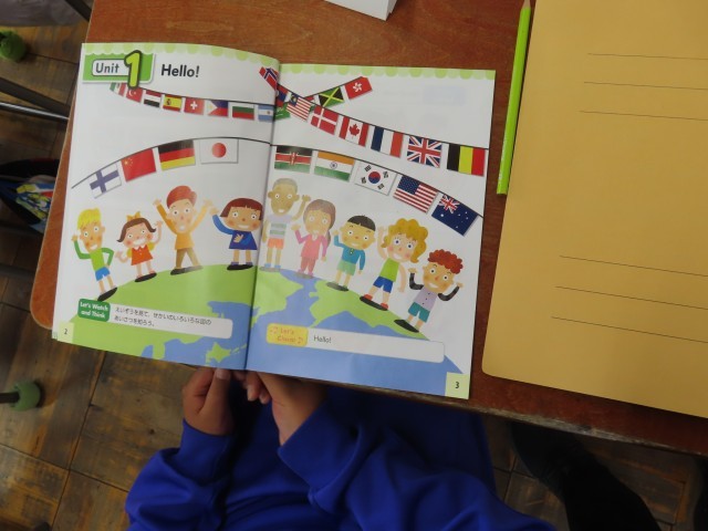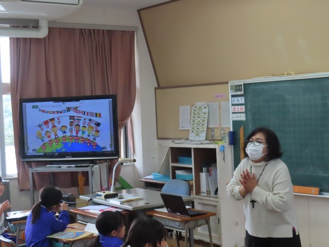 3年生が外国語活動の学習に取り組んでいました。今日は、さまざまな国のあいさつの仕方について学習していました。世界にはいろいろなあいさつの言い方があることに気付き、実際に声に出して練習したり、友達と伝え合ったりしながら、楽しく学んでいました。異なる文化に触れながら、意欲的に活動に取り組む姿が見られました。