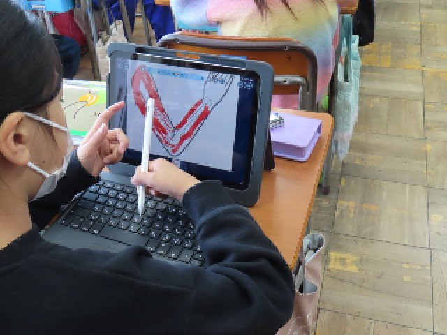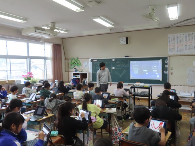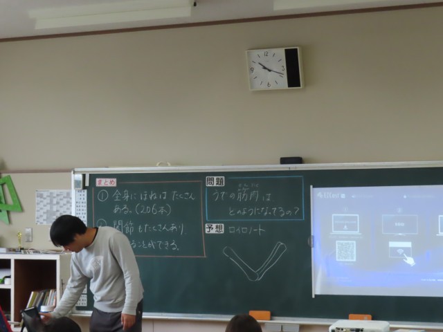 4年生の理科では、「動物のからだのつくりと運動」の学習をしています。今日は「うでの筋肉はどのようになっているのか」というめあてのもと、骨のまわりに筋肉がどのようについているのかを考え、図に色をつけながら予想していました。自分の体の動きを確かめながら考える様子も見られ、意欲的に学習に取り組んでいました。