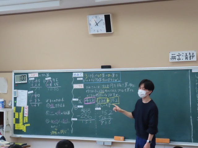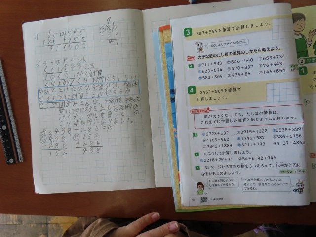 3年生が算数でたし算の筆算の学習に取り組んでいました。今日は3桁+3桁のたし算の筆算の仕方を考えていました。位ごとに数をそろえて計算することを確かめながら、数が大きくなってもこれまでに学習したやり方がそのまま使えることに気付き、理解を深めていました。友達の考え方も参考にしながら、正しく計算できるように意欲的に取り組んでいました。