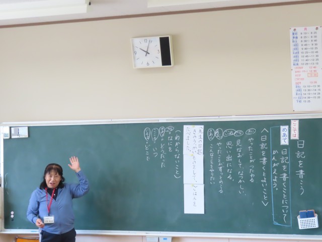 4月28日(火)2年生国語 公開日 2026/04/28 更新日 2026/04/28 できごと(2026) 2年生は国語で「日記を書こう」の学習をしていました。今日は、日記にはどのようなことを書いたらよいのかについて、みんなで考えました。出来事だけでなく、そのときの気持ちや感想を書くことの大切さにも気付き、友達の考えを聞きながら理解を深めていました。