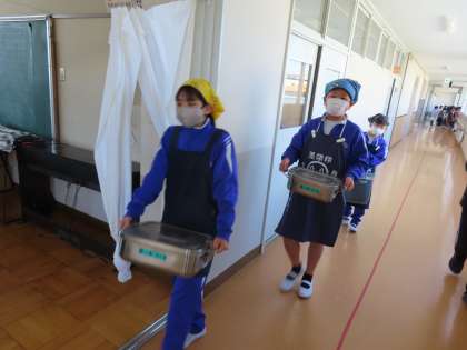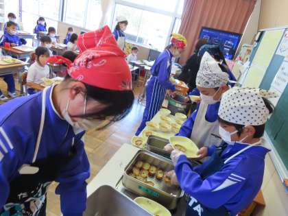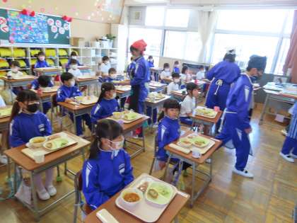 4月10日(水)6年生の活躍 公開日 2024/05/20 更新日 2024/05/20 できごと(2024) 今日も1年生の給食の準備を手伝いました。「きゅうしょく たのしみだな」と心待ちにしている1年生の姿が目の前にあるので、6年生は張り切って配膳をしています。