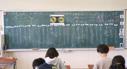 黒板には全員の考えが名前とともに貼られていました。五円玉の写真を見て、児童が気付いたことです。稲だ!農業だ!歯車のイメージ!工業のこと!児童のいろいろな気付きから生まれて広がる話題が、この1年間の社会科の学習に対する期待感につながっていたようです。