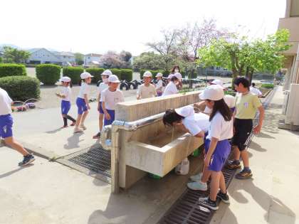 5時間目、校庭では4年生の2クラスが合同で体育をしていました。元気に走り回っておにごっこです。先生が説明するルールをよく聞いて、夢中になって走り回っていました。そしてしっかり途中で水分補給をします。顔を真っ赤にしながらガブガブ水を飲んでいました。そろそろ夏がやってくるのかという気持ちにさせるような天候になりました。本校では、児童の健康、安全を最優先して、水分補給等に留意して今年度も熱中症の未然防止に努めます。