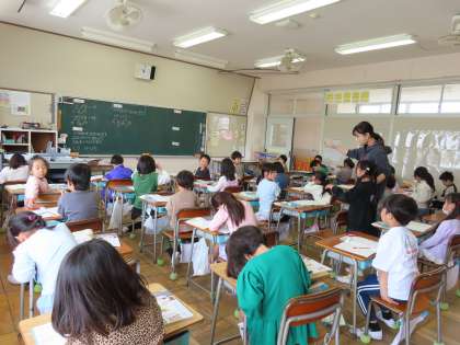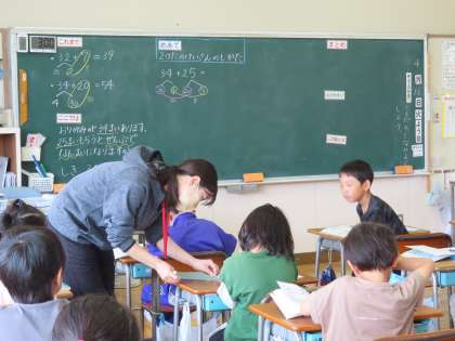 2けたの計算の仕方について考えていました。教室に入ると、先生の「すごいね」「よくできたね」「いいかんがえだね」「もうできたのね」たくさんの嬉しそうな声が聞こえてきました。こうして先生に見てもらって誉めてもらうとさらにやる気がパワーアップします。
