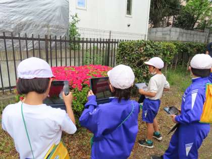 4月17日(水)4年生 理科 公開日 2024/05/20 更新日 2024/05/20 できごと(2024) たんけんバッグを背負って、タブレットを持って、外で観察をしていました。春になってあたたかくなると生き物の様子はどうかな?4年生の理科では、1年間、四季を通して植物や動物の変化を調べます。観察していると、知りたくなることがほんとうにたくさんです。「ここでは」学習する意欲が最高点に達しました。そして理科の学習を通して、児童の観察する目、自然や環境を大切にする姿勢が育っていきます。