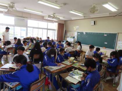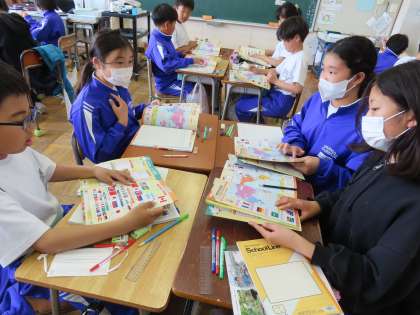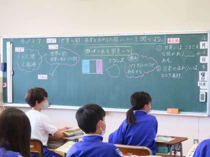 5年生の社会科では、日本のまわりの国から始まって、世界の国々について学習します。今日は、いろいろな国の国旗シールを使った活動を通して「ここでは」学習することへの興味・関心を高めていました。テレビをつけるといろいろな国々の話題が飛び込んできます。嬉しいニュースばかりではなく悲しいこともたくさんです。今、こうして小学生は、社会科の学習を通して、世界中みんなが平和で幸せに暮らせるよう願って学習していることを私たち大人は忘れてはいけないと思います。