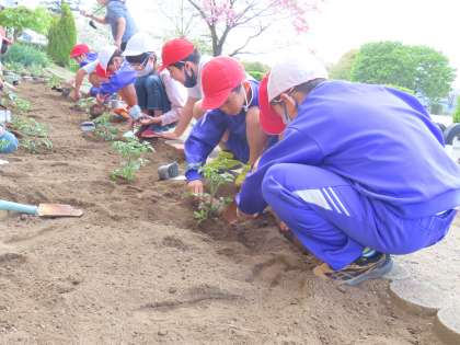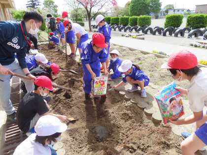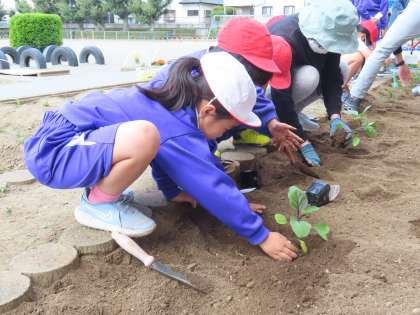 1時間目に、みんなで協力して畑づくりをしました。肥料をまぜて、畑を耕して、トマトやナスの苗を植えて、お水をあげました。