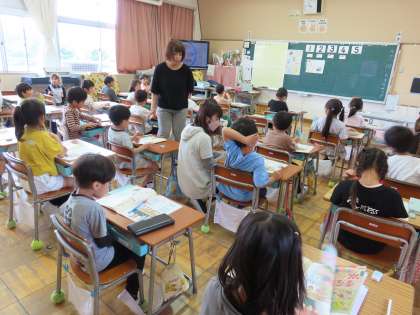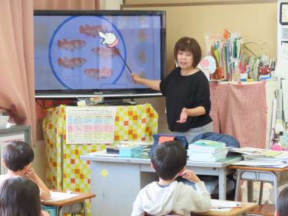「おさかなさんのかずをかぞえましょう」ちょうど教室では、絵を見て、魚の数をみんなで一緒に数えていました。そしてノートに「5」数字を上手に書いていました。上手に書ける数がどんどん増えていきます。