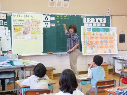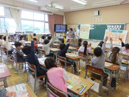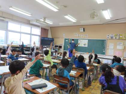 4月22日(月)1年生 算数 公開日 2024/05/20 更新日 2024/05/20 できごと(2024) 先生の質問にどんどん手があがり、しっかり答えることができます。今日は、6以上の数字を学習していました。絵のなかから7つあるものは?「はい。○○です」すると友達からその発言に対してしっかり反応があります。こうして1年生は、授業の中で自分の発言を言うこと、友達の発言から学ぶことを身に付けています。